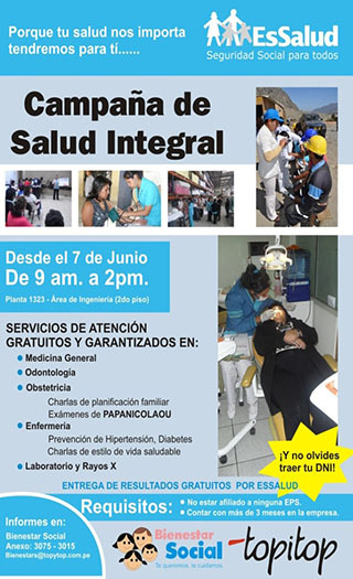 En un esfuerzo entre empresa privada y estado, Topitop les da la oportunidad a todos nuestros colaboradores, que por diversos motivos no pueden utilizar su seguro social, de recibir EN PLANTA atenciones de ESSALUD en medicina general, Odontología, Obstetricia, Enfermería, Laboratorio y Rayos X.