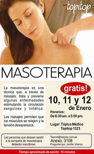 Todos de alguna manera, sentimos cansancio o fatiga muscular, por el mismo ritmo de trabajo diario y las exigencias que tenemos por alcanzar la excelencia en nuestra labor. Para hacerle frente a estas pequeñas incomodidades, te traemos esta campaña de Masoterapia del 10 al 12 de Enero. Informes e inscripciones en el Tópico Médico – anexo 3108. ¡Los esperamos!